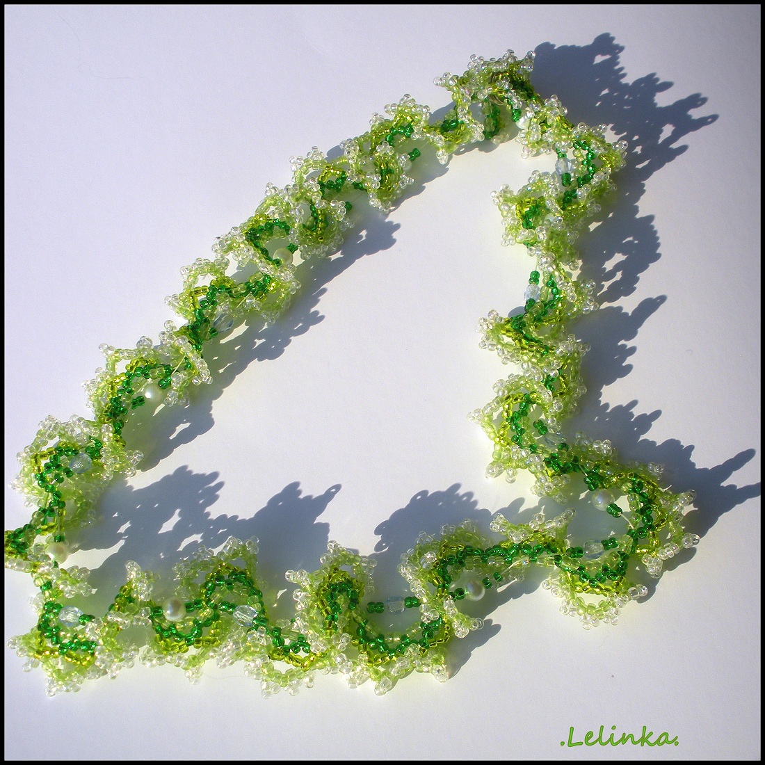 Jemně řasený náhrdelník v zelených tónech z českého rokajlu, který je navlečen na niti nymo a má délku 46,5 cm. Zapínání na cvoček