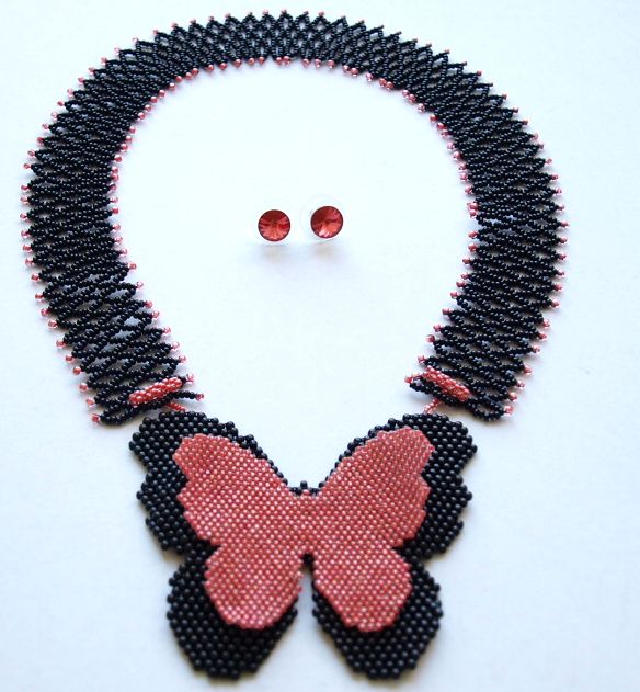 Ještě jsem zapoměla dodat, že je to k těmhle šatům. Mě taky připadá ten motýl prázdný, mám rozdělaného ještě červeného z patnáctek, kterého bych chtěla dát do centra toho velkého. Zkoušela jsem dělat i dvoubarevné, ale to mi moc nesedělo k těm šatům. Fotky zkreslují, ale ty červené jsou stejné jak na šatech tak špercích.