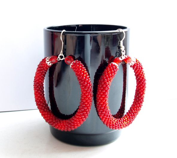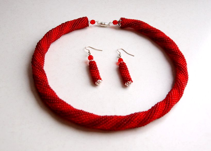 Já bych si k tomu vzala už jen červené pecky (třeba i koupené) ve stejné červené. Náhrdelník je dost výrazný a s výraznými náušnicemi by se tloukl.