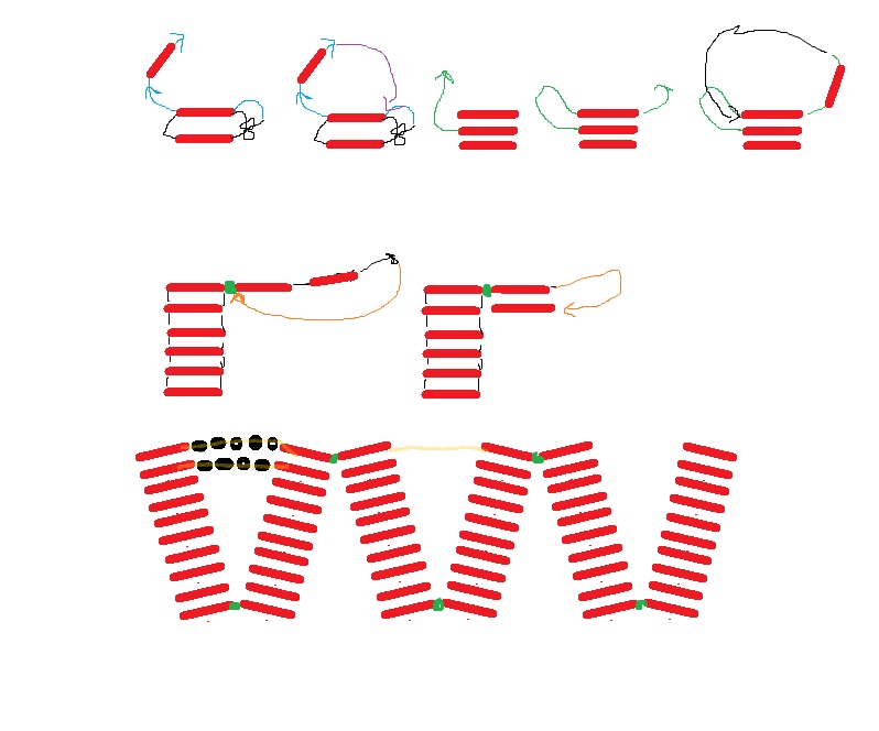 začíná se těmi tyčkami...... jako se šije ladder stitch, tak se usije tohle... :O snd je to ladder )))) začneš dvem tyčkami které svážeš do uzlíku.... pak navlékneš další tyčku, jehlu protáhneš tou tyčkou druhou a zpátky touhle co jsi navlékla.. takhle to opakuješ podle potřebné tloušťky náramku. pak na další řasu navlékneš jeden rokajl a dvě tyčky najednou, protáhneš tou první a pak se vratíš tou druhou.... no a až máš potřebné množství tech cik cak blbinek, tak jen těmi tyčkami protahuješ rokajl... tma kde jsou ty tyčky nejdál od sebe bude napři 15 kousků vedle 14..13..12..11....10 .... až to toho růžku, kde se vejdou tak 2 rokajly a ten jeden ten už tam máme navlečený ze začátků....