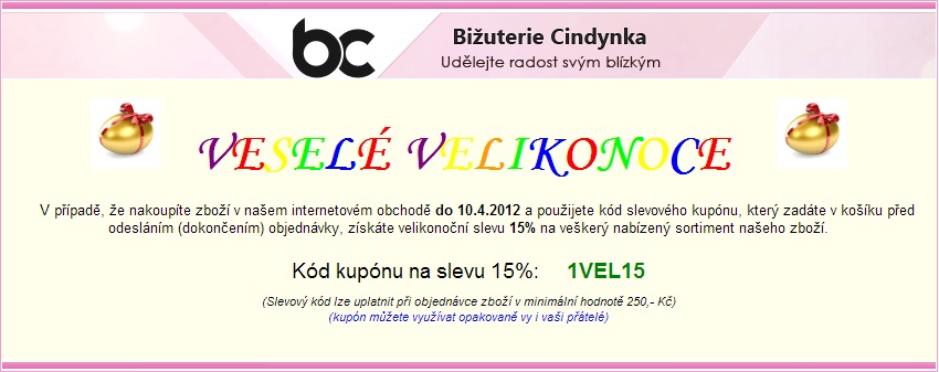 Pokud nakoupíte zboží v našem eshopu do 22.4.2014 a použijete kód slevového kupónu VEL20, který zadáte v košíku před vytvořením objednávky, získáte velikonoční slevu 20% na veškerý nabízený sortiment.