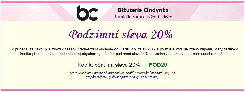 Sleva platí do 20.10.2013, kód slevového kupónu POD20. Více informací najdete na http://www.cindynka.cz
