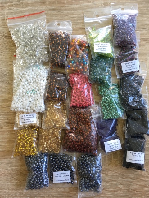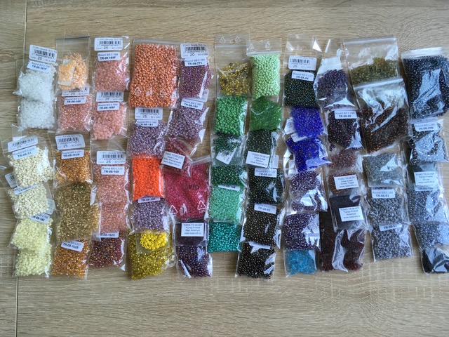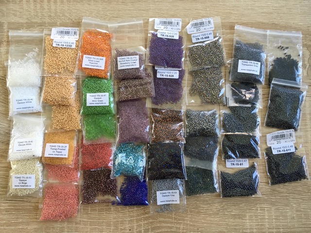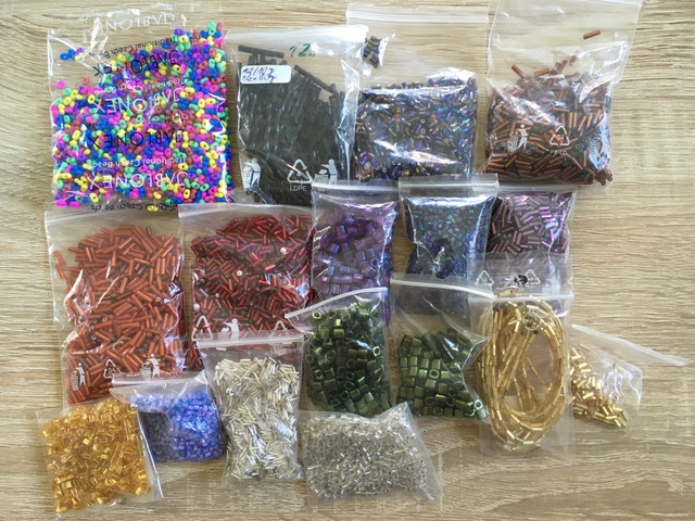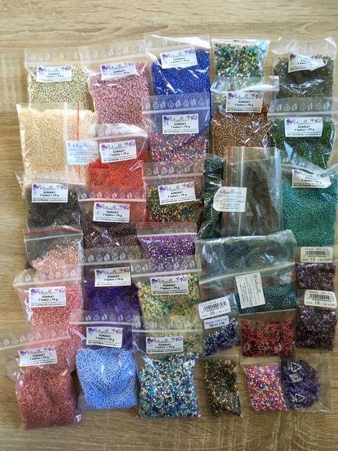 z důvodu, že jsem na rodičáku a nemám čas na korálkování, s těžkým srdcem ruším většinu svých zásob a chci je poslat dál, ať z nich má někdo jiný radost. Jedná se především o rokajl TOHO (odhaduji tak na 70%), zbytek rokajlu je Preciosa a český rokajl. Drtivá většina je velikost 11/0, něco málo 8/0 a 6/0. Hodně balíčků je nerozbalených, některé TOHO jsou sesypané 2-3 originální pytlíčky do většího (v kufru mi dělal nepletu ten přečuhující kousek plastu).