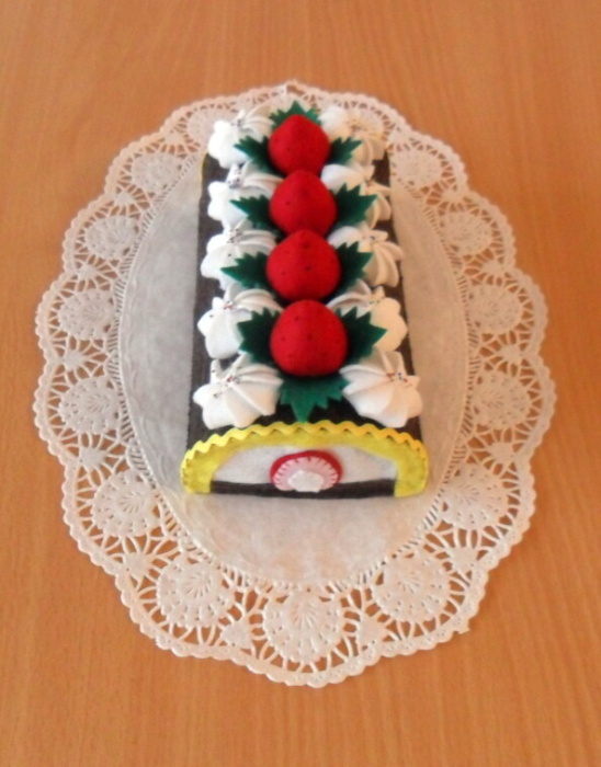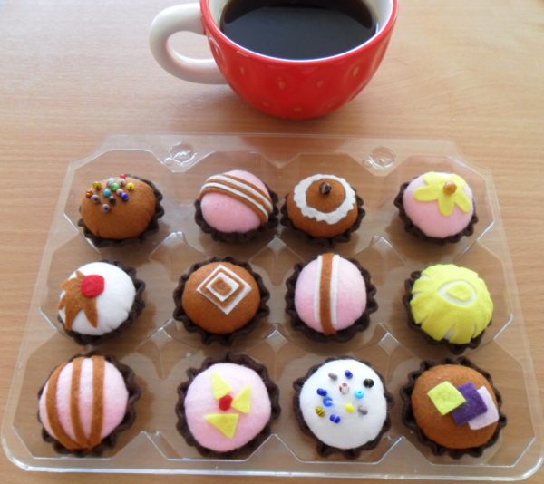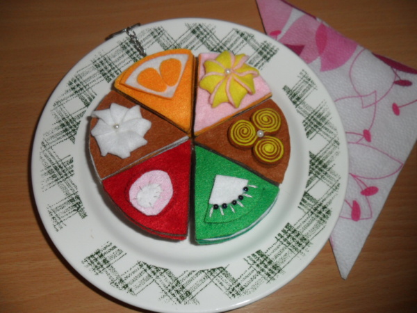 Dortíky jsem vytvářela pouze podle obrázku. Je to prvotina a musím ještě vychytat pár chybiček. Pokud by někdo věděl o postupu dortíků a zákusků z plstě /např. piccassa apod./ budu ráda, když písne. Tak dobrou chuť