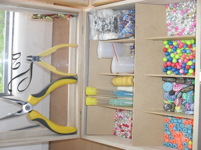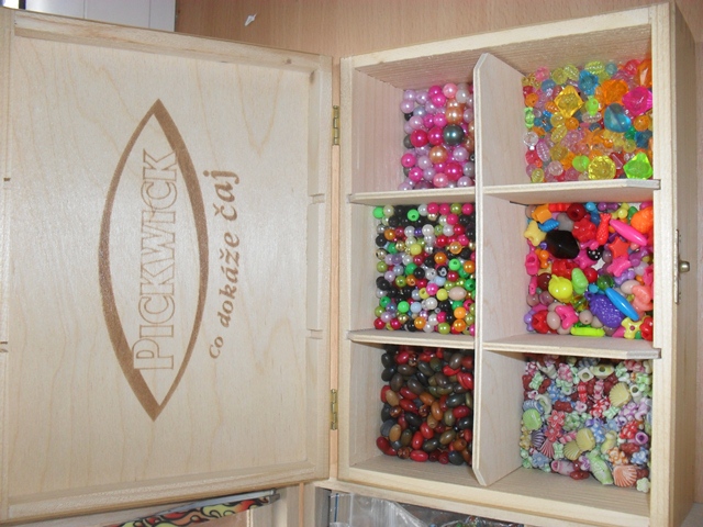 Vlevo nahoře, na skříňce: šuplíčky a šuplíky, v nich materiál tříděný podle jakýchsi nepochopitelných pravidel, někde podle barvy, někde podle druhu